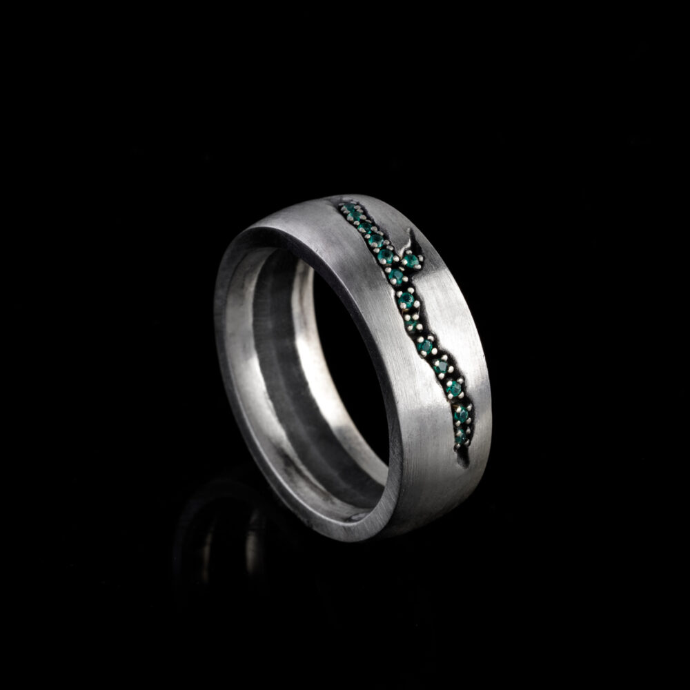 Le linee spezzate sono state simbolicamente “saldate” con Diamanti bianchi e neri, Zaffiri, Rubini e Smeraldi, rendendo ogni anello unico e prezioso.